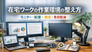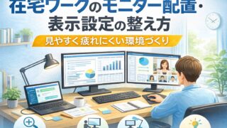 在宅ワークでモニターが見づらい、目が疲れる、首や肩がつらいと感じた時に見直したい配置と表示設定を整理。拡大率、輝度、距離、高さ、画面の使い分けまで分かりやすくまとめます。