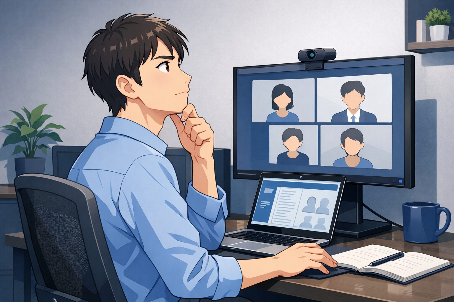 常にカメラを見る必要はありません。発言するときだけでも、カメラ付近(モニター上部)に視線を戻せるように、相手ウィンドウや話すメモを近くに置く工夫が効きます。