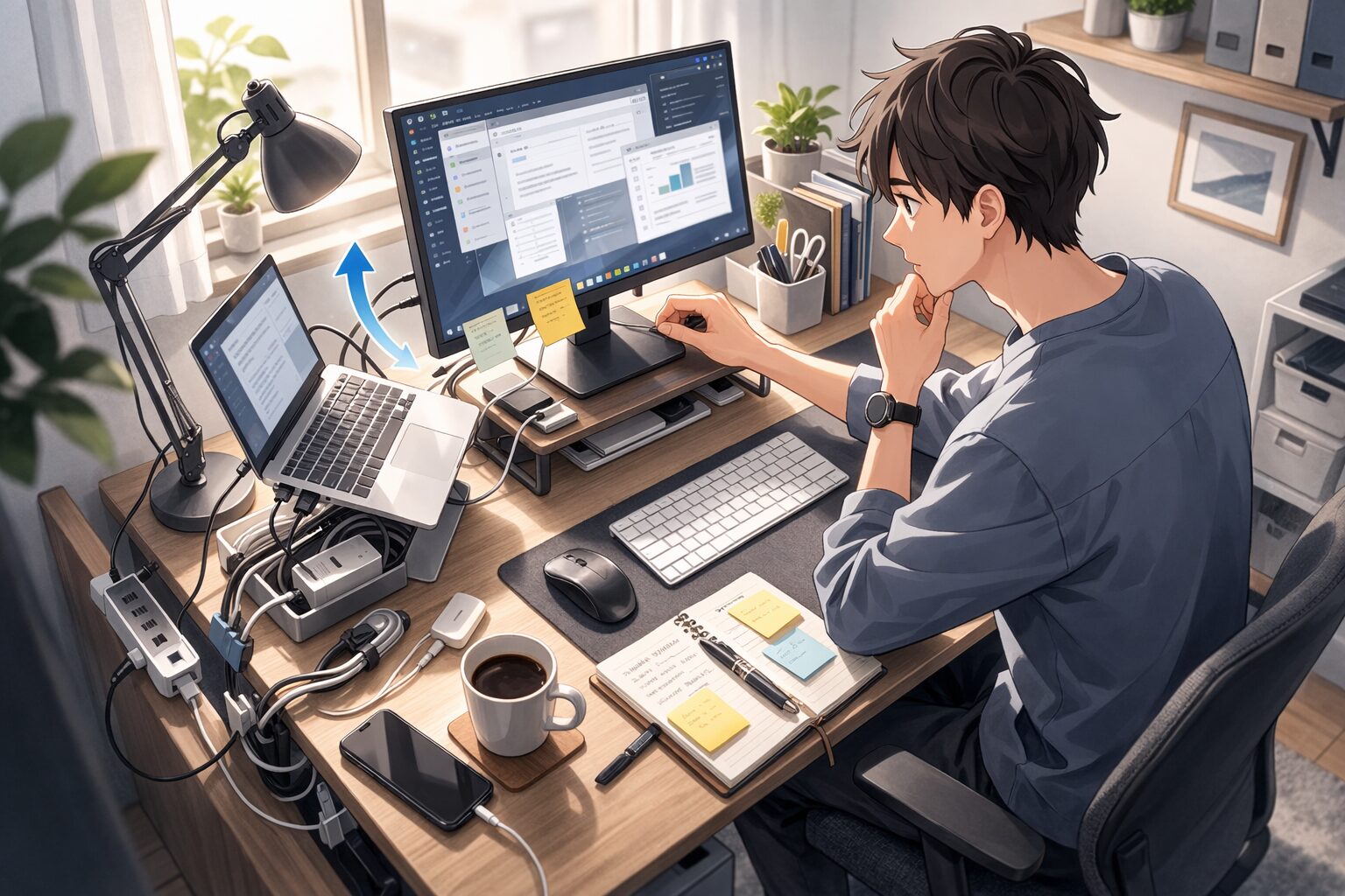 さらに、ノートPC+モニターの組み合わせは便利な反面、充電器・ハブ・ケーブルが増えやすく、配置の調整をしないと“机の上の交通渋滞”が起きがちです。まずは「何が場所を取っているか」を把握するのが第一歩です。