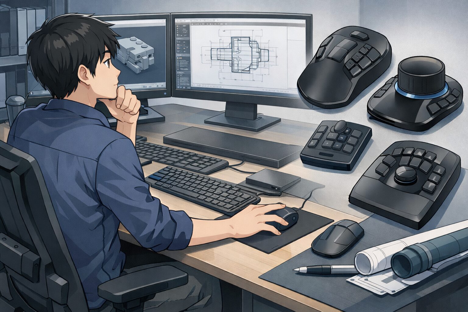 反対に、閲覧中心で修正が少ない、2D図面の確認が中心、作業時間が短いといった使い方なら、普通のマウスでも十分なケースがあります。大事なのは「専用機器がないと作業できないか」ではなく、「今の使い方で余計な負担や無駄な切り替えが増えていないか」を見ることです。CAD向けマウス、左手デバイス、SpaceMouse系機器のような選択肢はありますが、どれも全員に合うわけではありません。向いていない使い方を減らす発想のほうが、失敗しにくいです。