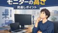 さらに、狭い机ではモニターとの距離を取りにくくなります。距離が足りないと、画面全体を見渡しにくくなり、首だけでなく目の負担も増えやすくなります。表示倍率や解像度が合っていないと、見やすさの問題がさらに重なります。